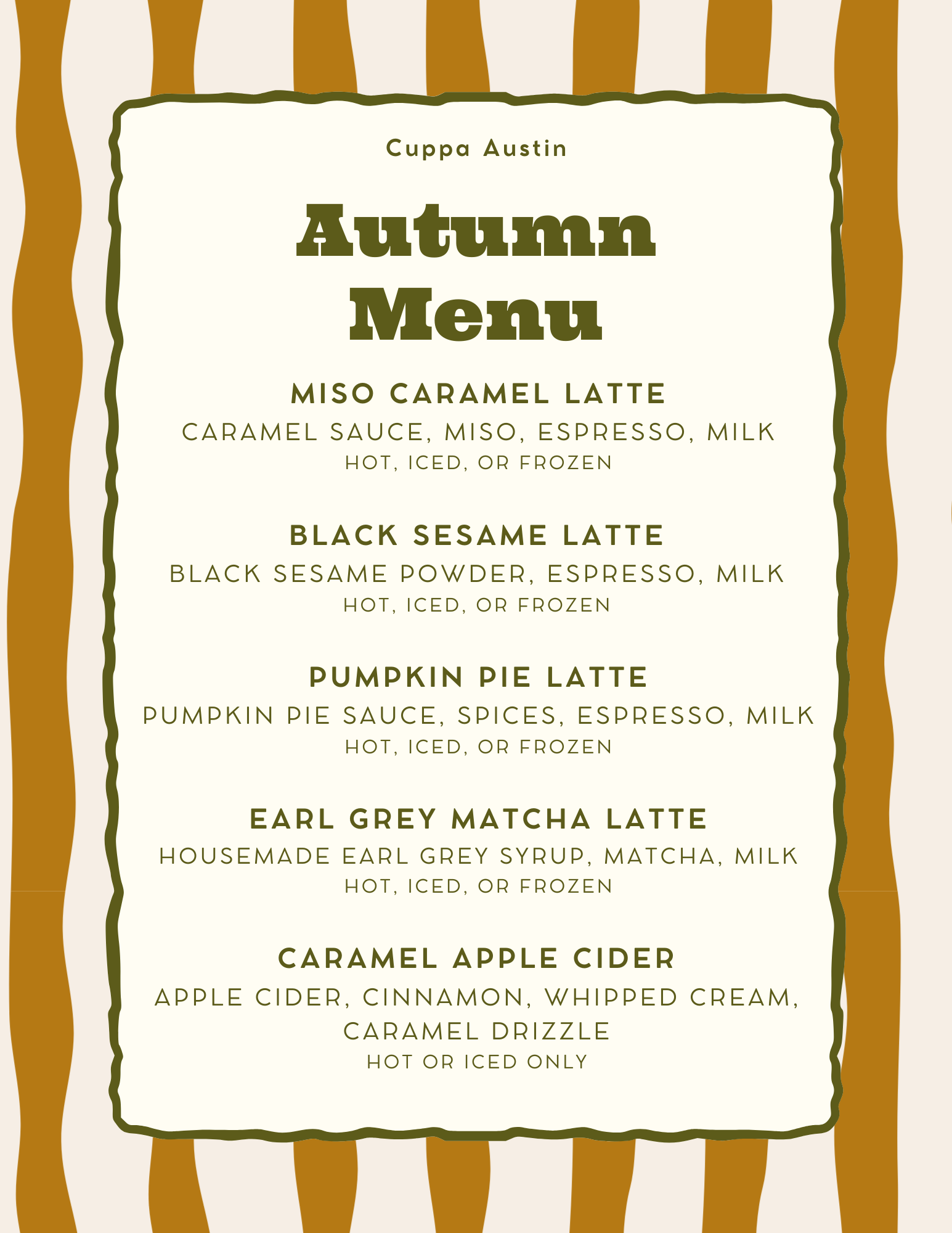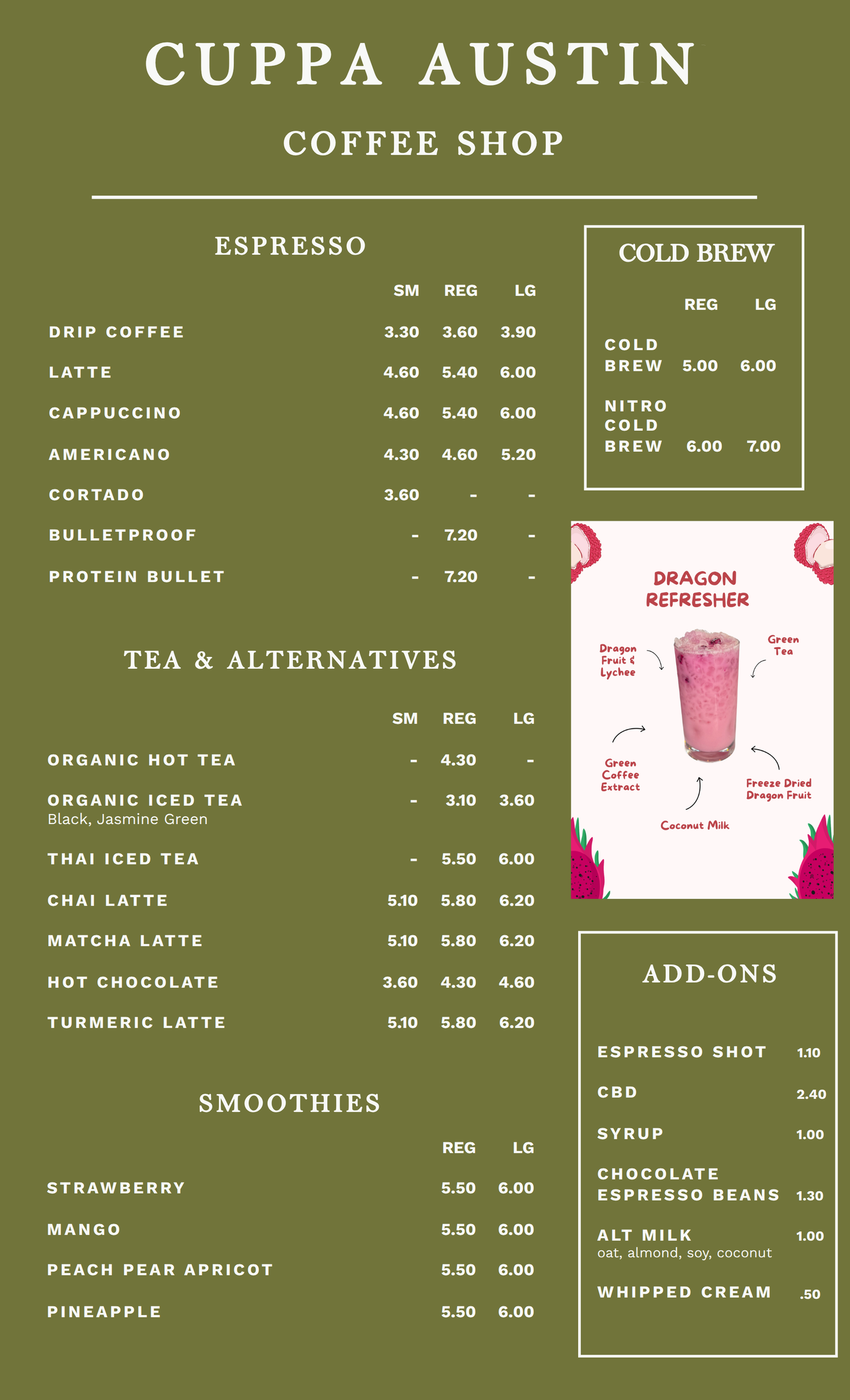 Check out our menu for the delicious food and drink options available year-round at Cuppa Austin Coffee! Our gourmet coffee shop also offers seasonal menu items, which can also be found in-store or on our Facebook and Instagram pages. Feel free to reach out to our coffee shop today if you have any questions.